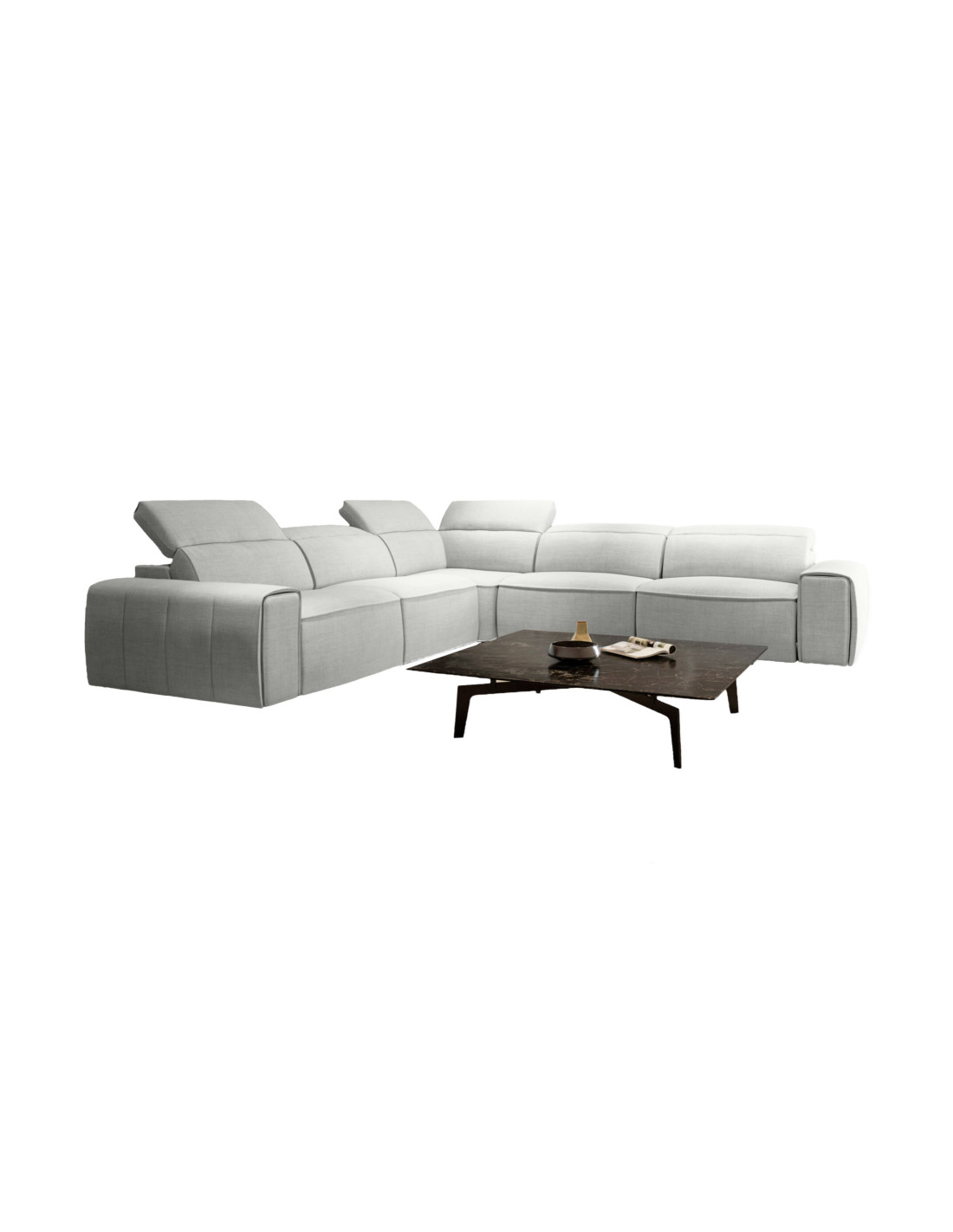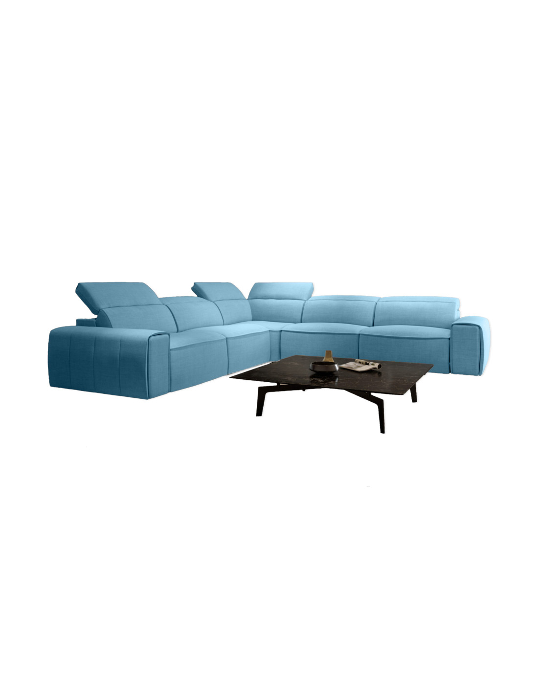 Divano angolare composto da tre posti a due sedute con angolo e tre posti a due sedute.